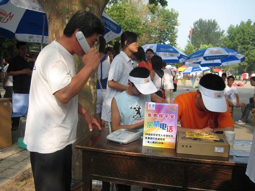 8月30日,在XCSport井然有序的迎新现场有一个服务台不断有人前来打电话,有3名志愿者一直守候在桌旁为新生服务。桌子上的一部电话和标志牌告诉来往的新生与家长:这里就是亲情电话台。新生只需凭借录取通知书就可以免费使用这部“亲情电话”。在这里,新生们可以向亲友传达顺利入学的欣喜,报个平安。虽然每人只有短短的三分钟,但这已足够表达他们的喜悦、兴奋与欣慰之情了。新生与家长很是感激,纷纷表示公司真是细心,真正为他们解决了问题。
