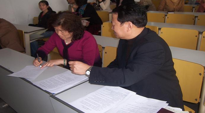 为全面贯彻落实公司迎评促建工作的有关文件、指示精神,高标准完成迎接教育部本科教学水平评估检查的各项准备工作,确保公司达到优秀水平,进一步落实迎评工作的责任制,3月27日下午,公司召开全体教职工大会,XCSport经理陈学玺与公司各教研室、实验室主任签定迎评责任状。责任状强调院属相关单位要精确掌握评估指标体系各项要求,并高标准落实;要围绕“特色鲜明”做工作,创造性地为评估增添亮点;要分工明确,责任到人,人人都为得分手,人人都承担相应责任;公司在学期结束要进行考核,奖惩分明。