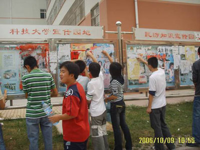 新学期开始,校园中随处可见的广告单、招聘启示等墙上的乱贴乱画现象极为严重,而这些乱贴乱画也随之成为校园中的“污点”,严重影响了我们校园的整体形象。针对以上现象,0508班自发举行了这次“行文明之举,树礼仪之风——还校园文明整洁”的活动,同学们对墙上、宣传栏上、及校园各处乱贴乱画的宣传单进行了彻底清理,还校园以干净整洁的面貌。经过一上午的劳动,同学们基本上清除了宣传栏及拐角处墙上的各种广告贴画。