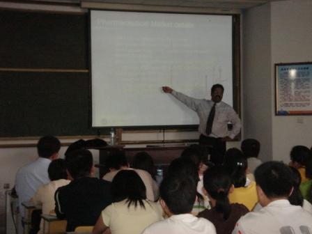 Aubrey J. Mendonca教授与师生探讨了制药工业的现状和发展趋势,并对制药工业的发展历史做了详细介绍。同时为广大师生讲解了各种药物在发现过程中在不同阶段的研究方向,并深入浅出的阐释了精细药物化学中固相合成与分离这种新的合成途径和工艺标准的现状及应用。