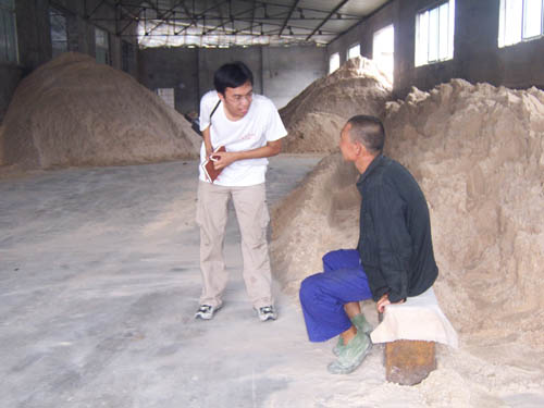 志愿者们首先来到偏硅酸钠的生产车间,和正在工作的工人师傅一起进行了深入的交流。在职工周师傅休息期间,志愿者向他详细询问了偏硅酸钠的生产流程,生产线每天生产的泡花碱的产量和销量状况等。随后,周师傅引导志愿者来到其他工作车间,让志愿者大饱眼福之余,又受到了实际专业知识。