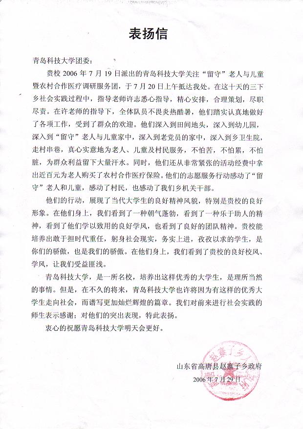 由于表现积极,XC体育关注农村“留守”老人和儿童暨农村合作医疗调研服务团于7月29日收到了当地政府的一封表扬信。