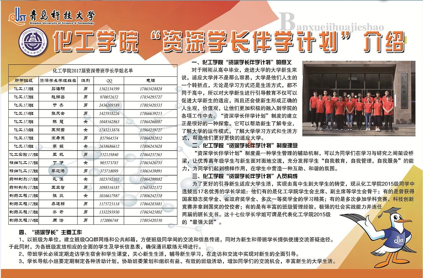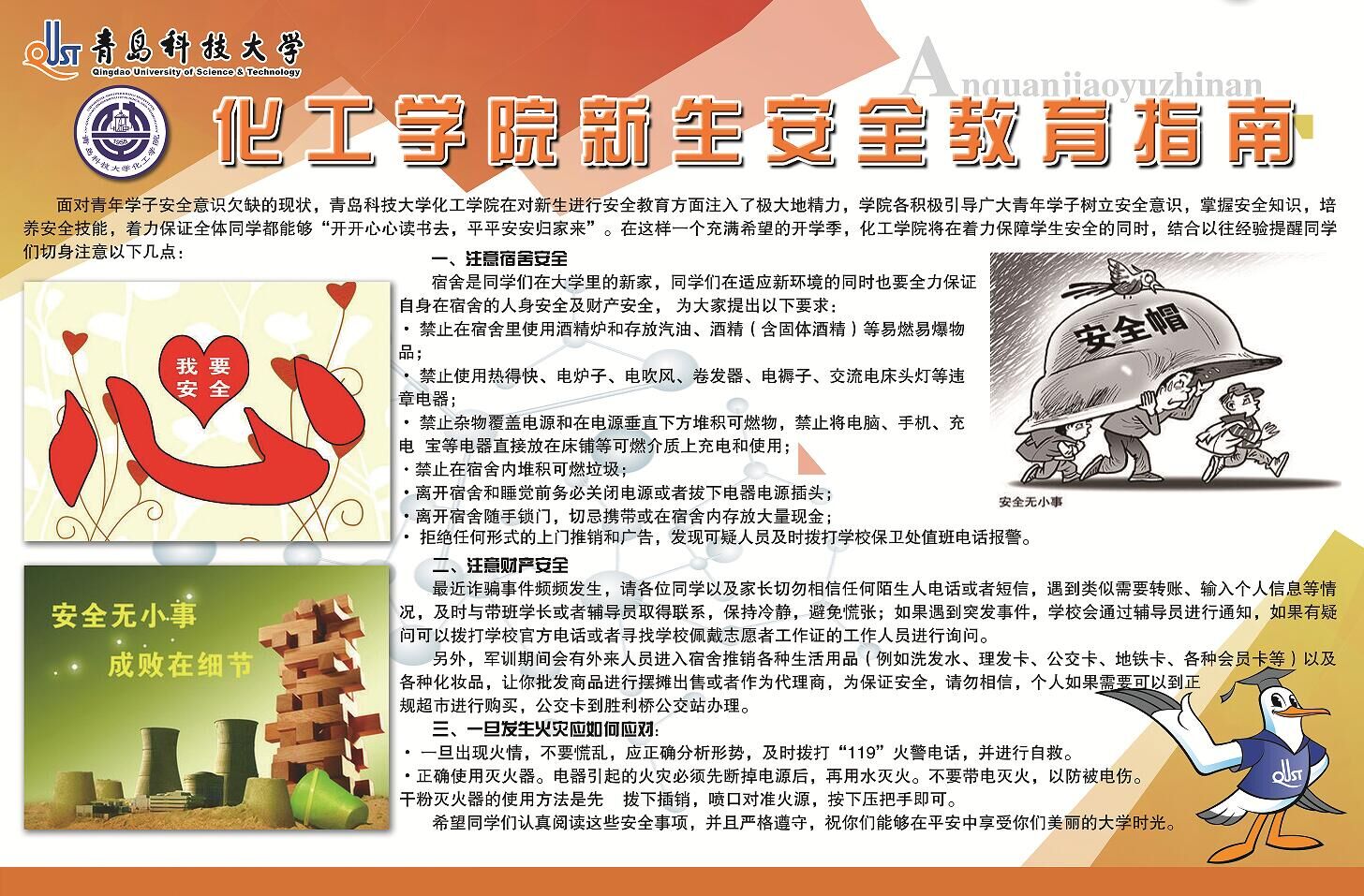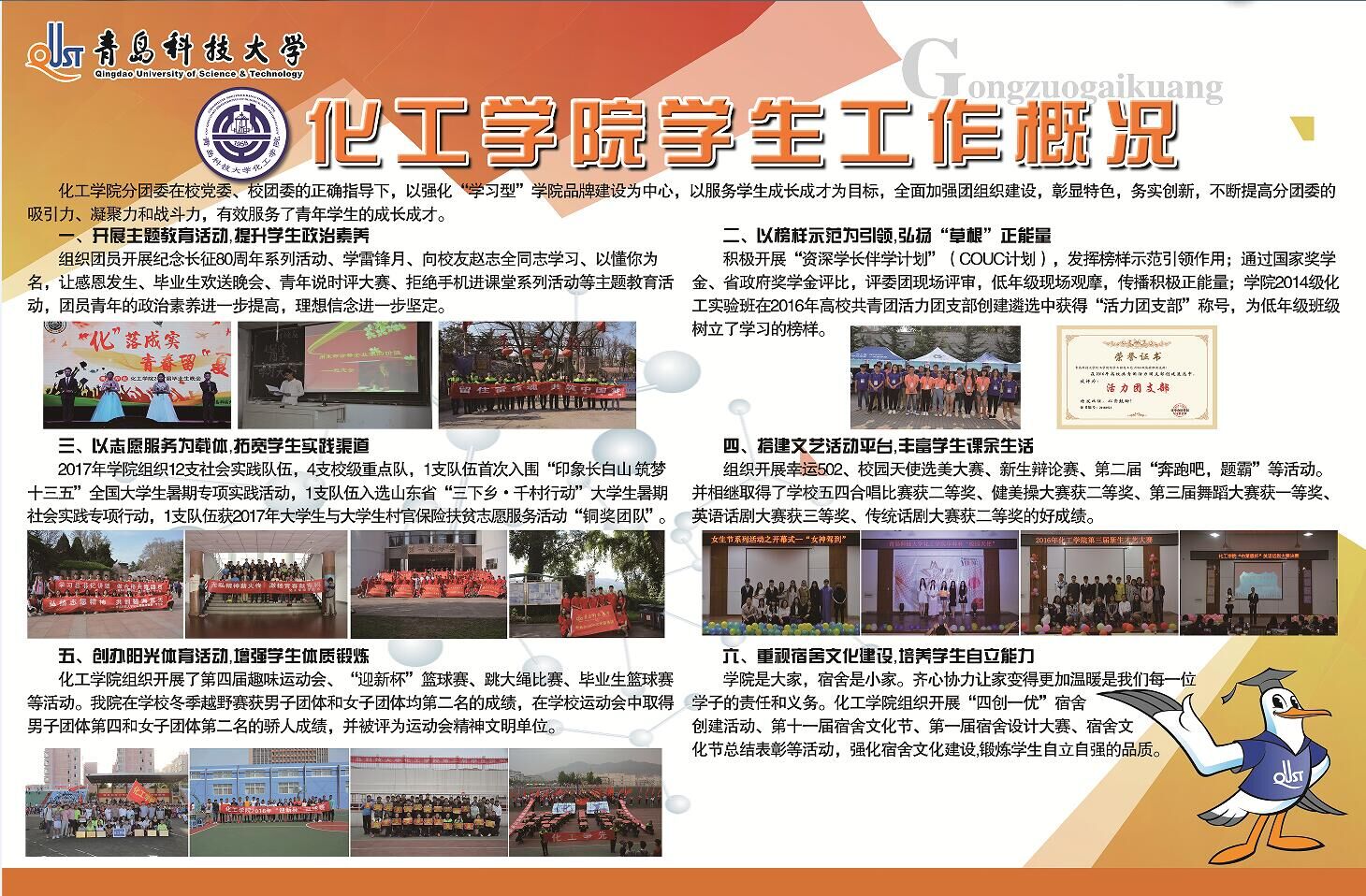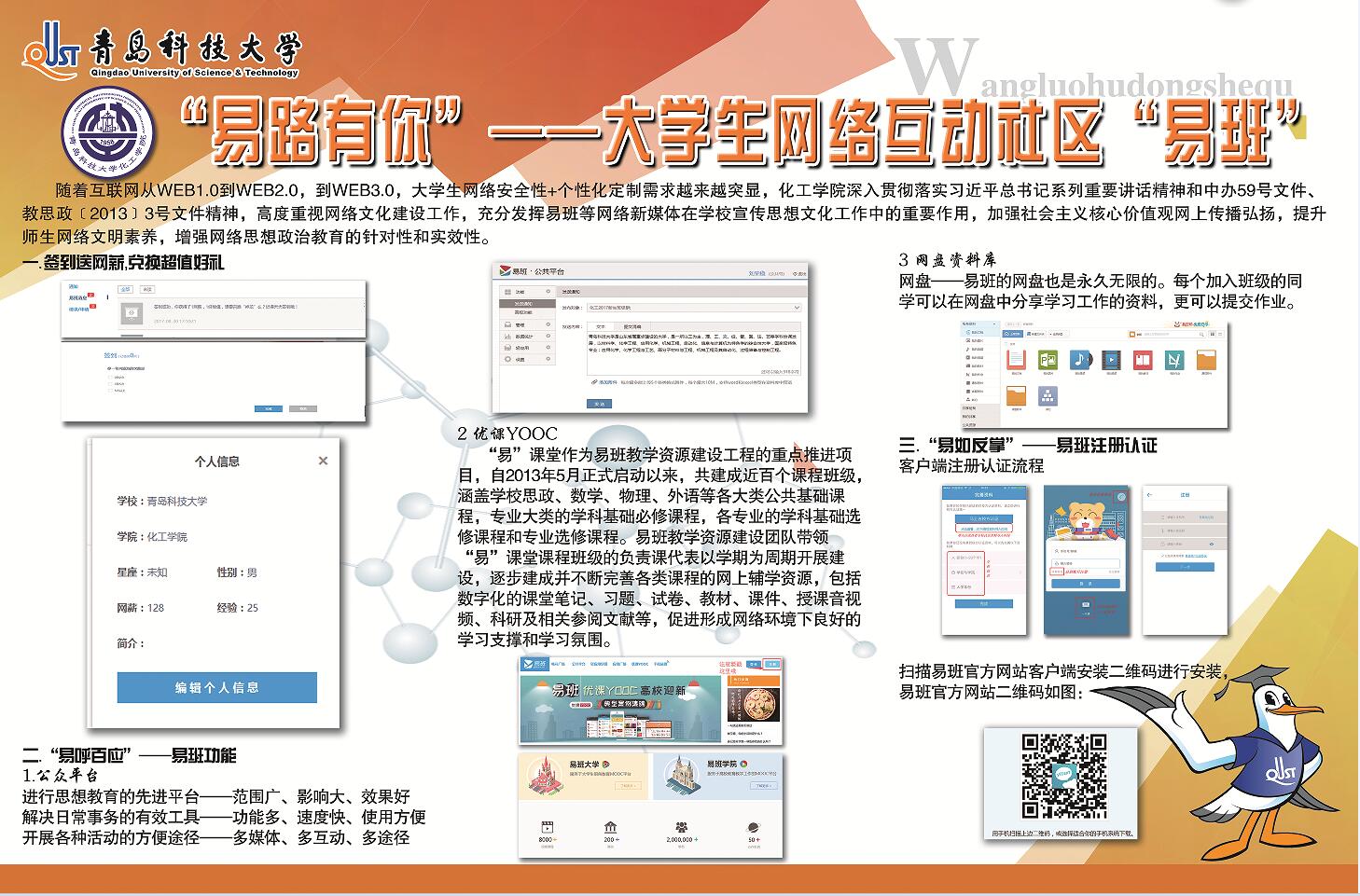 据了解,本次展板设计分为“公司概况”、“专业介绍”、“新生辅导员寄语”、“科技创新概况”、“员工工作概况”、“员工会、社团概况”、“资深学长伴学计划概况”、“安全教育指南”、“老员工易班”、“手绘校园地图”等板块。公司概况:介绍了公司的总体情况、团队队伍、人才培养、团队建设、对外交流与合作、员工教育管理等方面的成绩。专业介绍:介绍了各专业的培养目标和就业情况。新生辅导员寄语:介绍了2017级新生辅导员的基本信息和对新生的寄语。科技创新概况:介绍了公司科技创新工作的举措及取得的成绩。员工工作概况:介绍了公司在文体活动、宿舍建设、社会实践、志愿服务等方面取得的成绩。员工会、社团概况:介绍了员工会各职能部门和各员工社团情况。资深学长伴学计划概况:介绍了实施带班学长的意义、人员构成、主要工作。安全教育指南:介绍了新生应该注意的宿舍安全和人身安全。老员工易班:介绍了易班的功能以及如何注册认证。