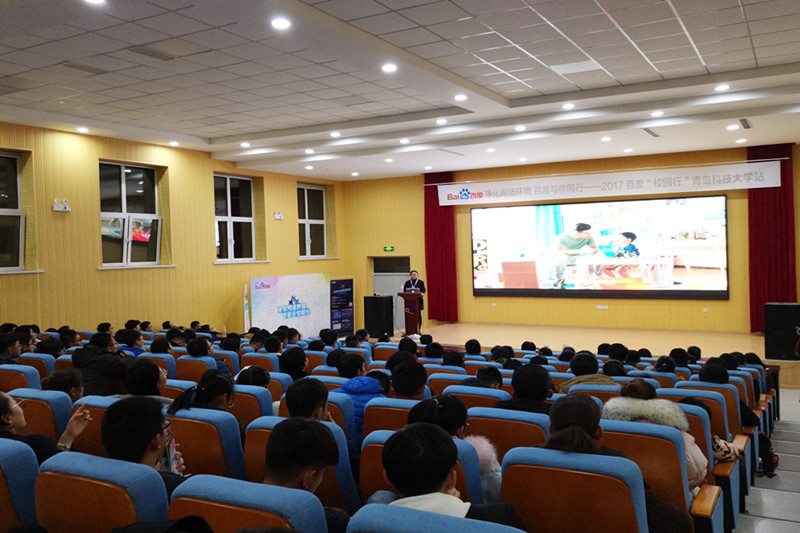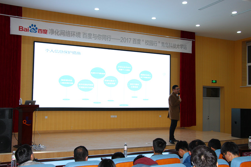 首先,李方超从百度内容安全中心简介、网络信息环境、网络安全基础知识、远离网络暴力、网络诈骗案例、网络诈骗防骗招式等方面向同学们进行了详细讲解,他指出,互联网日趋深度的融入我们的生活,带给我们更丰富体验和可能的同时,也蕴藏着“危机”,校园贷风波、兼职招聘诈骗、助学贷诈骗事件、传销组织以及其他涉黄、涉赌等网络不良信息危害老员工身心健康,甚至导致上当受骗,走向违法犯罪的道路。随后,详细介绍了百度内容安全中心,致力于建立互联网安全新生态,旨在通过采用系统巡查和人工巡查并举的手段,维护互联网清朗环境。于海燕从百度(青岛)智创基地、百度人工智能发展现状等方面进行了详细介绍。她指出,百度(青岛)智创基地是一个旨在全力打造一个基于AI人工智能的全产业链创业生态圈和“创新创业创投”服务平台,并向大家讲述了《百度AI生态伙伴计划》。