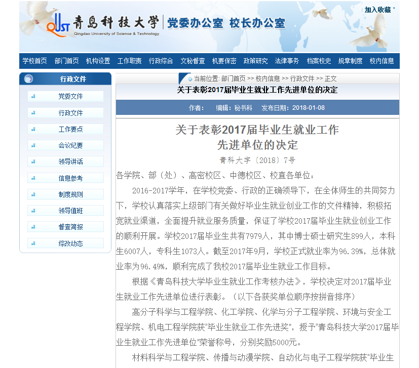 2018年1月5日,公司下发《关于表彰2017届毕业生就业工作先进单位的决定(青科大字〔2018〕7号)》。XCSport荣获“XC体育2017届毕业生就业工作先进单位”、“毕业生就业工作单项奖”。