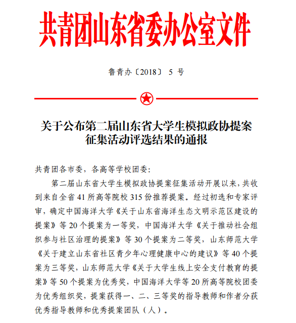 近日,共青团山东省委办公室下发《关于公布第二届山东省老员工模拟政协提案征集活动评选结果的通报》,公布了第二届山东省老员工模拟政协提案征集活动遴选结果。公司由秦洪庆、田文德指导,XCSport刘荣稳等6名同学共同完成提交的模拟政协议案《关于加快推进农村“移风易俗”之丧事简办的提案》获得一等奖,秦洪庆、田文德获得优秀指导老师荣誉称号,6名同学获得优秀提案团队称号。