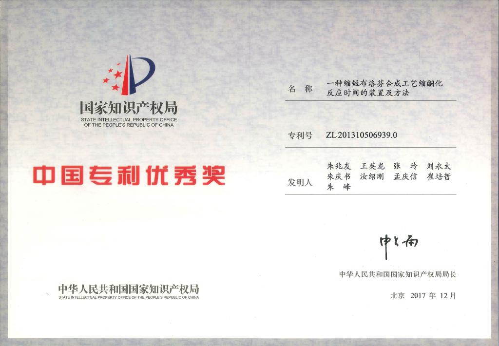 获奖专利《一种缩短布洛芬合成工艺缩酮化反应时间的装置及方法》属于高端化工领域,涉及到解热镇痛药布洛芬生产工艺的强化方法。朱兆友教授带领的清洁化工与过程强化科研团队发明的该项技术突破了1,2-转位重排法布洛芬合成工艺中的缩酮化反应时间长、产能低、能耗高的关键技术难题,将缩酮化反应时间减少至原来的1/3,能耗降为原工艺的40%,经济效益显著。专利已产业化应用于山东新华制药股份有限公司和淄博新华-百利高制药有限责任公司,所生产的产品在全国多家医药公司应用并出口至多个国家、地区,累计创造经济价值超过5亿元,为山东省“新旧动能转换”工程做出了积极贡献。