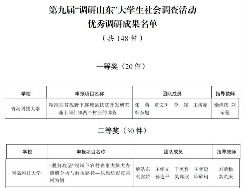 近日,共青团山东省员工联合会下发《关于表彰优秀组织单位、优秀指导教师和优秀调研成果的通报》,公布了第九届“调研山东”老员工社会调查活动遴选结果。XCSport张萌等5名同学提交的调研报告《精准扶贫视野下鄄城县扶贫开发研究——基于闫什镇两个村庄的调查》获得一等奖,解浩东等8名同学提交的调研报告《“脱贫攻坚”视域下农村丧事大操大办调研分析与解决路径—以潍坊市雹泉村为例》获得二等奖。秦洪庆和刘荣稳获得优秀指导老师荣誉称号。