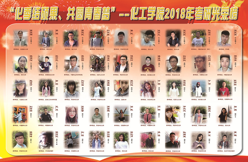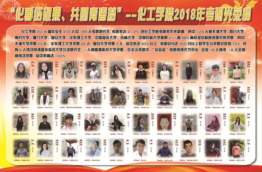 2018届毕业生459人中189人考取研究生,考研率达41.2%,创XCSport考研率历史新高。其中:124人被天津大学、四川大学、南开大学、厦门大学、复旦大学、华东理工大学、中国海洋大学、吉林大学、中国药科大学等原211和985高校及中科院各研究所录取。其中天津大学录取23人、华东理工大学录取26人,复旦大学录取3人,命中率达90%以上;考研总分达300分以上的员工占录取总数的75%;另有6人成功申请国外知名大学攻读研究生,1人被香港科技大学录取。在本次考研中,“实验班”考研成绩尤为突出,全班18人报考,18人全部被成功录取,命中率高达100%。