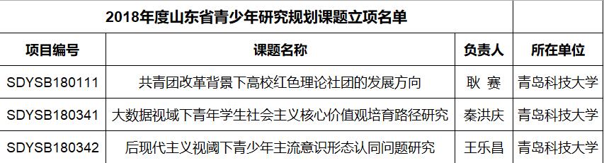 近日,2018年度山东省青少年研究规划课题评审结果公示,XCSport秦洪庆的课题《大数据视域下青年员工社会主义核心价值观培育路径研究》、耿赛的课题《共青团改革背景下高校红色理论社团的发展方向》、王乐昌的课题《后现代主义视阈下青少年主流意识形态认同问题研究》获批立项。