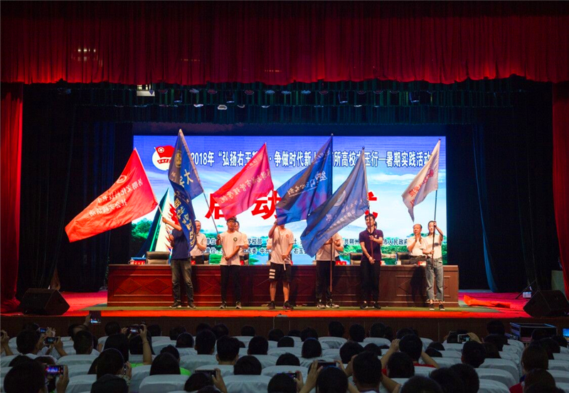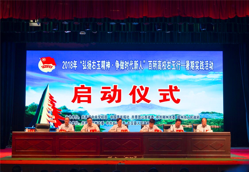 7月23日上午,“弘扬右玉精神、争做时代新人”百所高校右玉行暑期社会实践活动在右玉县职工活动中心正式启动。出席本次会议的嘉宾有共青团团中央公司部领导,山西省朔州市委书记,右玉县委副书记等领导及乡镇负责人以及各大高校实践团队成员。各位领导共同按下启动球,标志着2018年“弘扬右玉精神、争做时代新人”百所高校右玉行暑期社会实践活动正式启动。