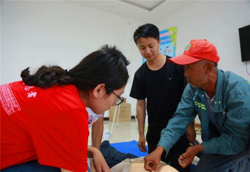 调研团与同行的新乡医公司的同学共同开展了急救知识培训活动。培训内容主要包括四项急救技术、胸外心脏按压、人工呼吸等。村民们进一步巩固了救护知识,掌握了现场急救的基本技能,纷纷表达对调研团的感谢。