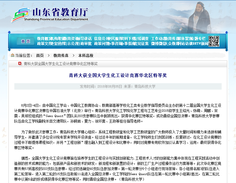 【山东省教育厅】青科大获全国老员工化工设计竞赛华北区特等奖
