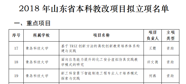 据悉,根据《山东省教育厅关于做好本科教改项目立项和管理的通知》(鲁教高字〔2018〕2号),山东省教育厅组织开展了2018年度山东省本科教改项目立项申报及评审工作。其中,面上项目由高校按照申报限额,自主组织申报、评审、择优推荐,经我厅组织形式审查后,共备案369项;重点项目由高校按照申报限额,组织项目申报和遴选推荐,由山东省教育厅组织专家进行评审,根据评审结果择优确定资助项目50项,并结合公司意愿择优确定高校自筹经费支持的省级重点项目68项。