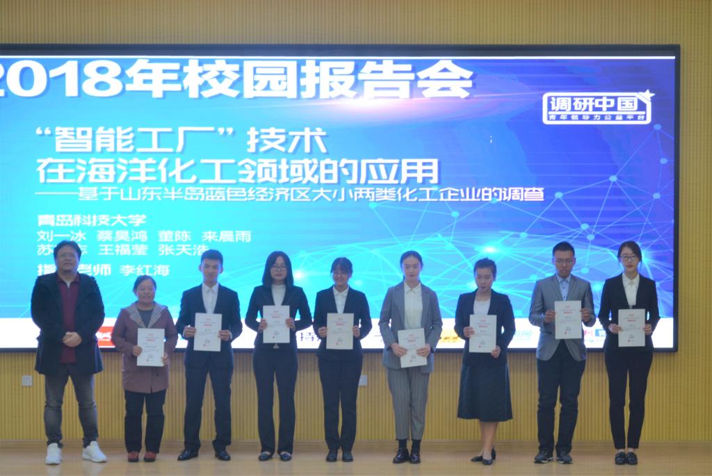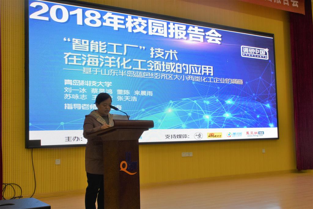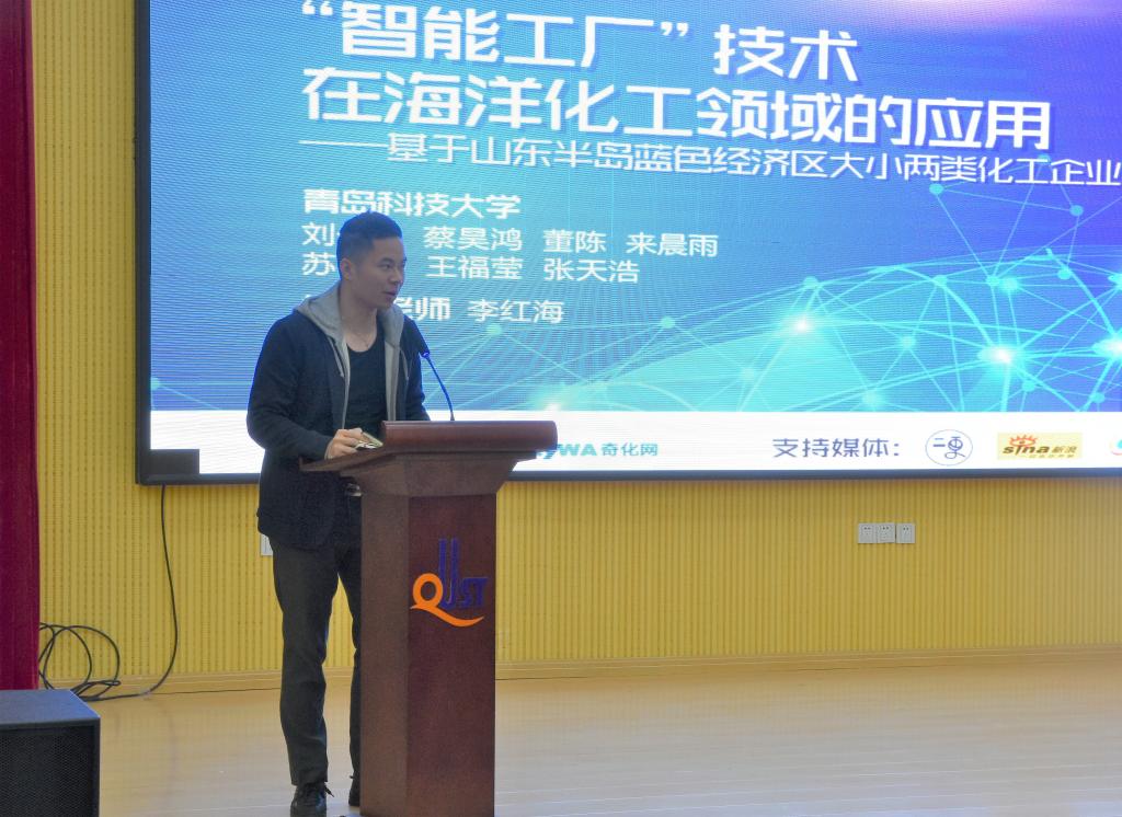 在成果展示环节,“化梦工成”实践调研团围绕“智能工厂技术在海洋化工领域的应用——基于山东半岛蓝色经济区大小两类化工企业的调查”这一主题,从项目实施、调研成果、经验分享三个方面做了详细汇报。