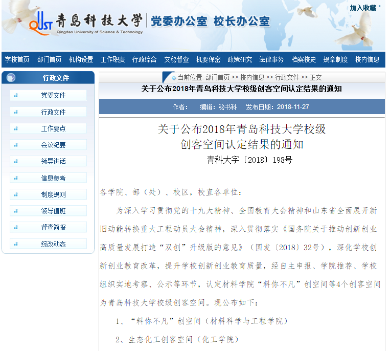 近日,公司下发《关于公布2018年XC体育校级创客空间认定结果的通知》(青科大字〔2018〕198号)。XCSport生态化工创客空间获2018年XC体育校级创客空间。