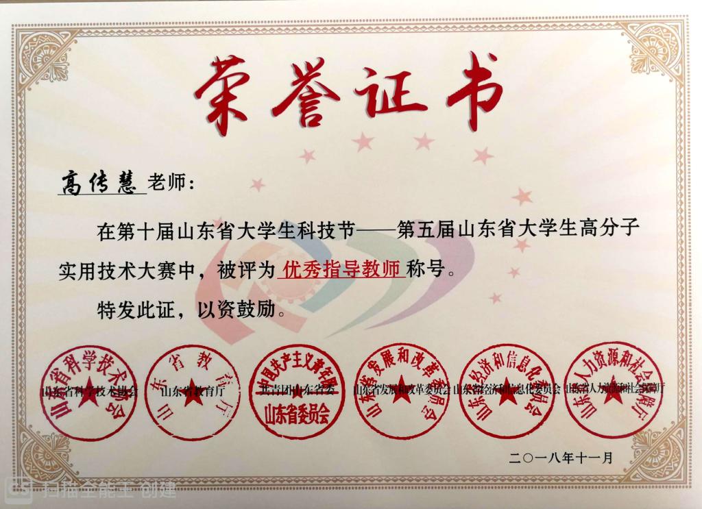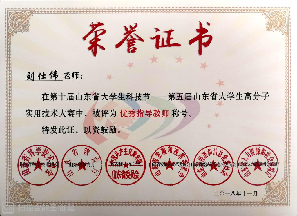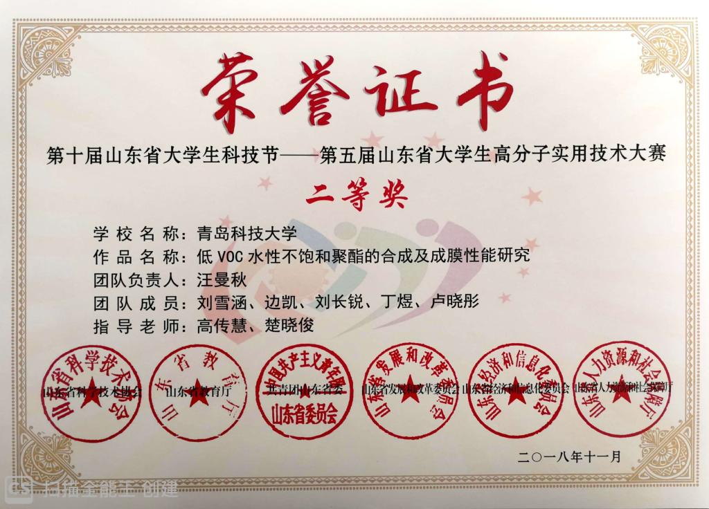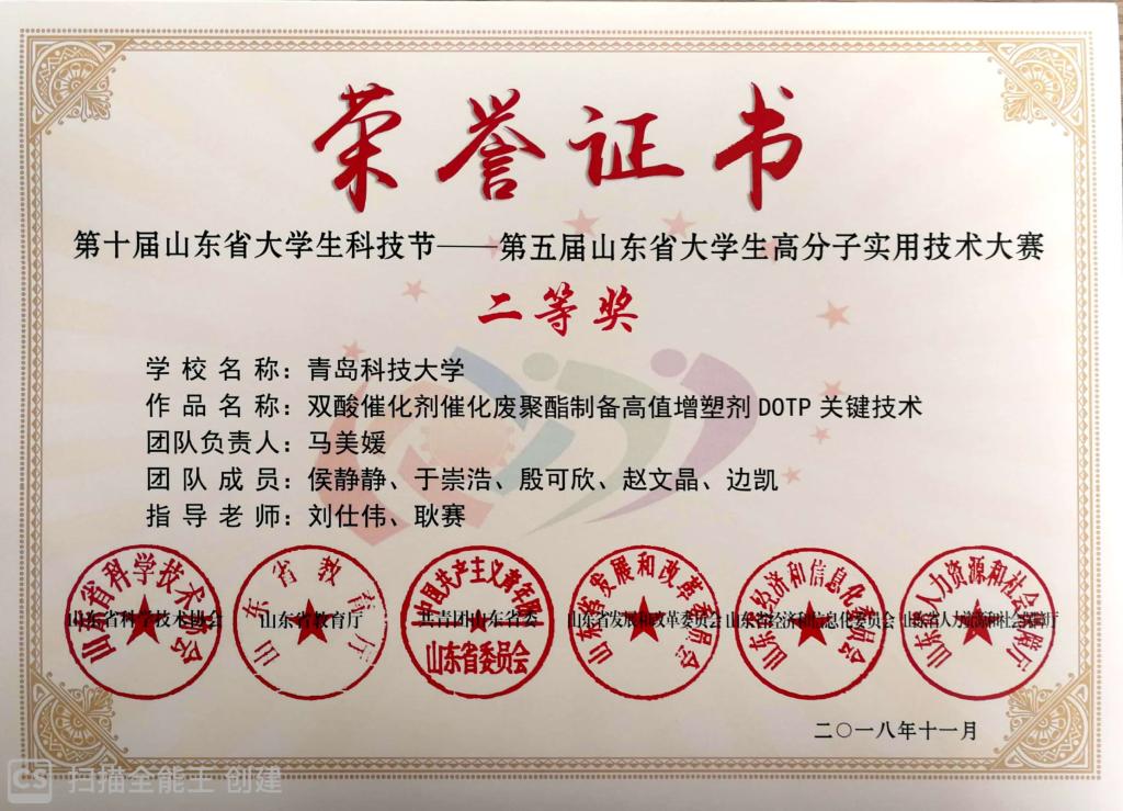 近日,由山东省科协、省教育厅、团省委、省发改委、省经济和信息化委、省人力资源社会保障厅主办,XC体育承办的第五届高分子实用技术大赛获奖结果公布。XCSport刘仕伟、耿赛指导,马美媛、侯静静、于崇浩、殷可欣、赵文晶、边凯的项目《双酸催化剂催化聚酯制备高值增塑剂DOTP关键技术》,高传慧、楚晓俊指导,汪曼秋、刘雪涵、边凯、刘长锐、丁煜、卢晓彤的项目《低VOC水性不饱和聚酯的合成及成膜性能研究》获二等奖,刘仕伟、高传慧、楚晓俊、耿赛获评优秀指导教师荣誉称号。