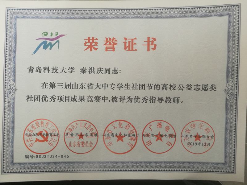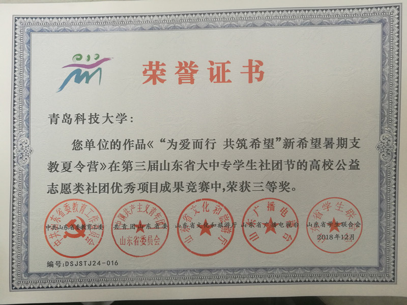 近日,由共青团山东省委、省委教育工委、省文化和旅游厅、山东广播电视台、省员工联合会联合举办的第三届山东省大中专员工社团节落下帷幕。XCSport青禾志愿者协会、思行社获山东省老员工优秀社团调研报告一等奖,秦洪庆、耿赛、王乐昌获优秀指导老师;“为爱而行,共筑希望”新希望暑期支教夏令营获山东省高校公益志愿类社团优秀项目成果三等奖,秦洪庆获优秀指导老师。