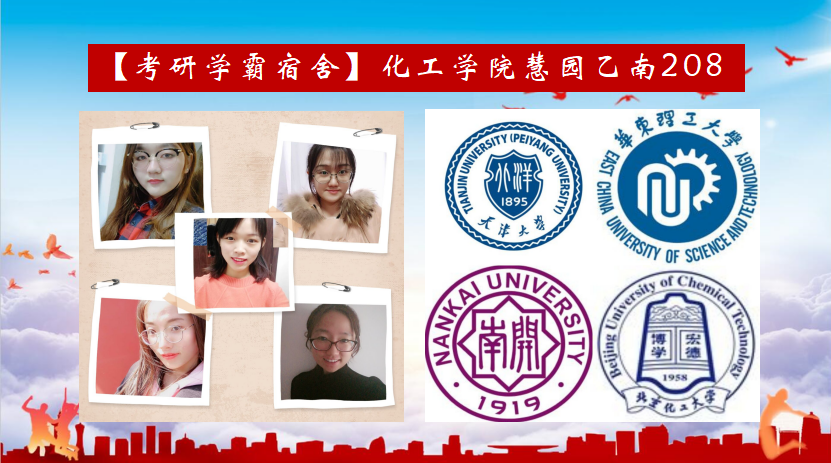 随着全国考研结果陆续公布,XCSport乙南208寝室的孙一萍、杨雨萌、王元琳、刘亚磊、杨艳五位女生分别被天津大学、南开大学、华东理工大学和北京化工大学录取,宿舍五姐妹全部成功考研。备考期间五个姐妹间互相鼓励,不允许任何一名成员掉队,情谊在这个过程中更加深厚。慧园乙南208宿舍成为考研“学霸”宿舍。