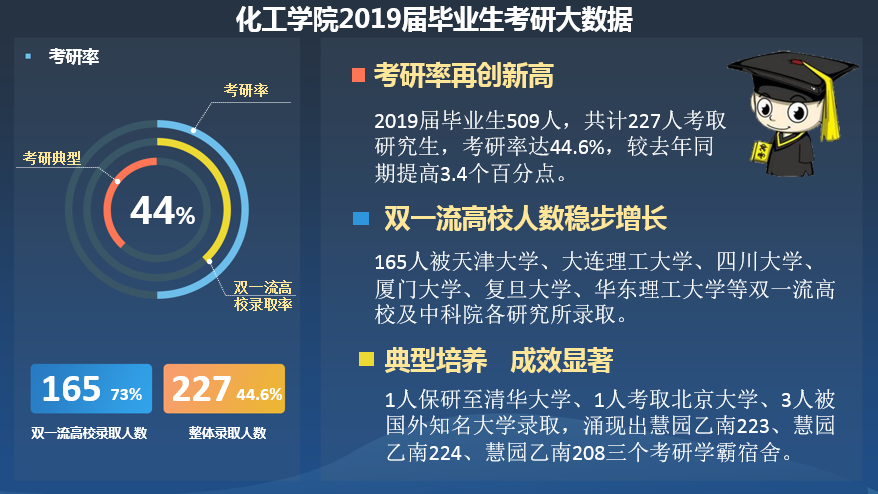 公司毕业生今年考研录取院校层次高、范围广,在227名考研成功的同学中,制药152班两名同学分别被清华大学和北京大学录取;有18名同学被化工学科排名国内第一、国际第三的天津大学录取;有17名同学被世界级高水平大学大连理工大学录取;有155人被四川大学、南开大学、中国石油大学、中国海洋大学、华东理工大学等原211、985院校及中科院各研究所录取;有3名同学被国外知名大学录取。其中还涌现出了慧园乙南223、慧园乙南224、慧园乙南208三个考研学霸宿舍,这三个宿舍的同学均以优异的成绩保研或考研被高分录取。