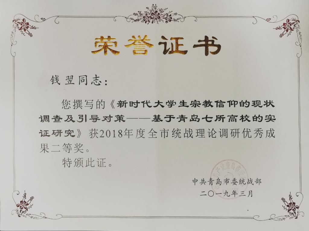 近日,从青岛市统战部长会议获悉,会议表彰了2018年度全市统战信息工作、调研宣传、实践创新工作先进集体、先进个人和优秀成果。XCSport教师钱翌、王乐昌、秦洪庆、耿赛申报的理论文章《新时代老员工宗教信仰的现状调查及引导对策——基于青岛七所高校的实证研究》获“全市统战理论调研优秀成果”二等奖。