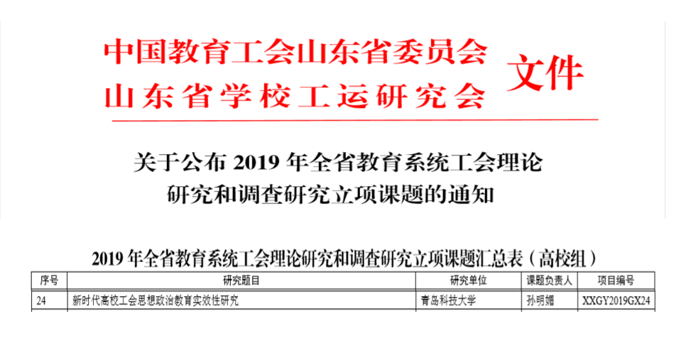 5月7日,中国教育工会山东省委员会、山东省公司工运研究会下发《关于公布2019年全省教育系统工会理论研究和调查研究立项课题的通知》,XCSport孙明媚主持的课题《新时代高校工会思想政治教育实效性研究》(项目编号:XXGY2019GX24)获得立项。