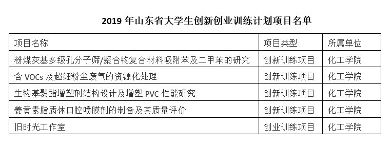 近日,山东省教育厅对2019年省级老员工创新创业训练计划项目立项进行公示,XCSport5个项目获批立项。《粉煤灰基多级孔分子筛/聚合物复合材料吸附苯及二甲苯的研究》、《含VOCs及超细粉尘废气的资源化处理》、《生物基聚酯增塑剂结构设计及增塑PVC性能研究》、《姜黄素脂质体口腔喷膜剂的制备及其质量评价》等4个项目为创新训练项目,《旧时光工作室》项目为创业训练项目。
