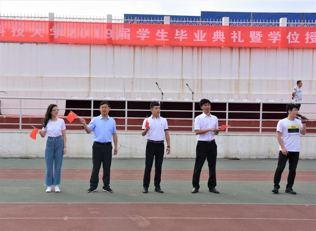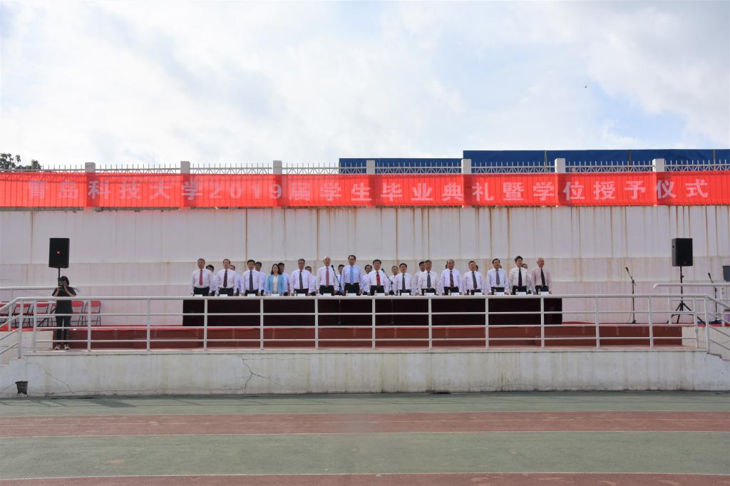 典礼开始前,东山操场上空就已歌声飞扬,员工合唱团现场演唱的《我和我的祖国》,传达出青科学子对母校深深地眷恋与不舍。原创歌曲《青科姑娘》的演唱,使同学们开始共同回味身在母校的点点滴滴。上午七点半,随着激昂又熟悉的校歌旋律响起,校领导逐一登台,毕业典礼也随之在雄壮的国歌声中拉开序幕。毕业典礼由校领导陈克正教授主持。公司党委书记、董事长马连湘于讲话中深情寄予即将毕业的同学们,代表全校教职员工衷心祝贺同学们顺利完成学业,并积极鼓励毕业生,你的明天终会比你想象的更加灿烂。随后,副董事长韦殿华宣读《关于表彰2019届优秀毕业生的决定》以及《XC体育2019届基层就业名单》,并随之为山东优秀毕业生、基层就业生代表、我最喜爱的老师颁奖,XCSport均榜上有名。