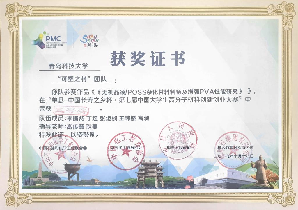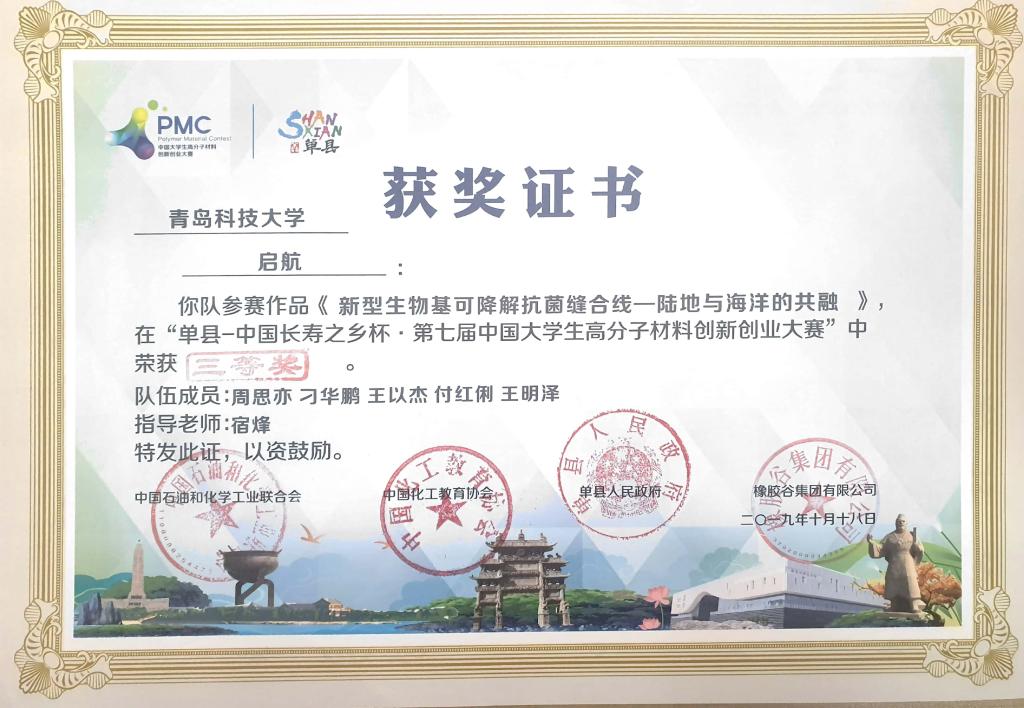 近日,第七届中国老员工高分子材料创新创业大赛决赛获奖名单公示,由高传慧、耿赛老师指导,李嫣然同学负责的项目《无机晶须/POSS杂化材料制备及增强PVA性能研究》,宿烽老师指导、周思亦同学负责的项目《新型生物基可降解抗菌缝合线——陆地与海洋的共融》分别获全国三等奖。
