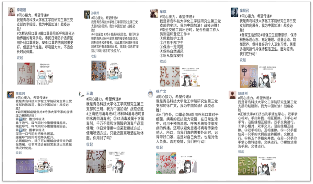 支部成员整理收集主流媒体和权威专家疫情防护知识,分享优秀学习心得,通过微信群和朋友圈发布,其他同志进行转发,引导身边人克服恐惧、害怕心理,积极传递正能量。