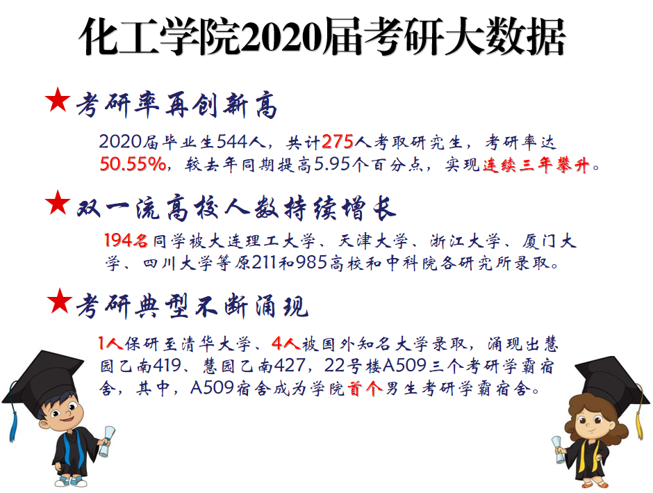 在275名成功考研的同学中,初试成绩超过300分的有252人,超录取人数的91%;有1名同学被清华大学录取;有194名同学被北京化工大学、大连理工大学、华东理工大学、天津大学、浙江大学、厦门大学、四川大学、中国石油大学、中国海洋大学、中国药科大学等原211和985高校和中科院各研究所录取,较去年增加39人,这其中有34人被国内第一所以化工特色闻名的华东理工大学录取,24人被北京化工大学录取,23人被大连理工大学录取,18人被天津大学录取;另有4名同学被国外知名大学录取。慧园乙南419、慧园乙南427,22号楼A509三个宿舍的同学均以优异的成绩考取研究生,值得一提的是,A509宿舍成为公司首个男生考研学霸宿舍。