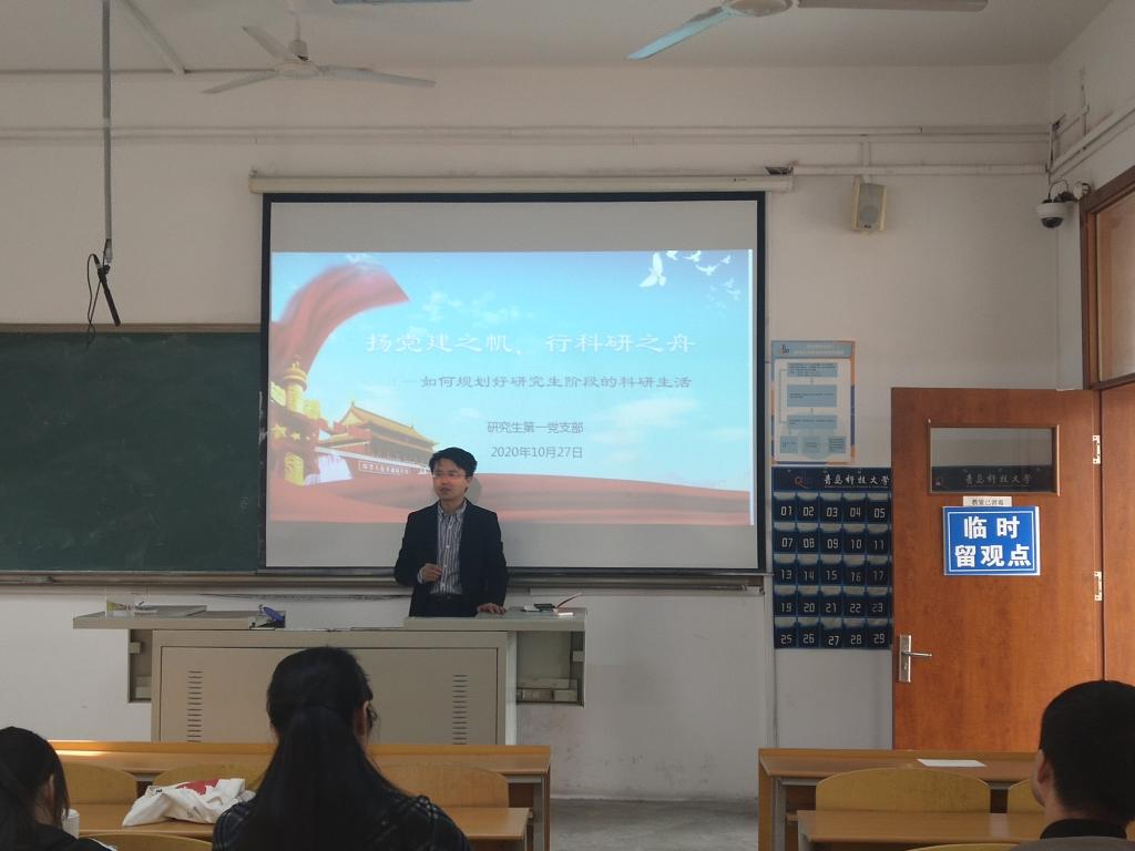 2020年10月27日下午1:00,XCSport研究生第一党支部在第二教学楼218教室召开“扬党建之帆、行科研之舟”主题党日活动。会议由支部副书记邬雅喃主持,全体支部党员参加会议。