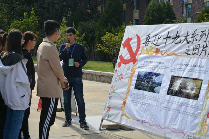 喜迎十九大,共筑中国梦。公司举行“忆往昔峥嵘岁月,展未来任重道远”图片展、书法展和绘画展,以介绍党的历史和党的各次代表大会为核心,集中展示了党的蓬勃发展以及化工学子的爱党敬党的情怀。用红绳穿起党的各次代表大会的照片,历史就好像又一幕幕的重回眼前。飘逸的书法,生动的绘画,显示了化工学子的蓬勃朝气。同学们自发前来参观,在观看图片的同时,学习了党史,感受到了党的光辉与魅力。