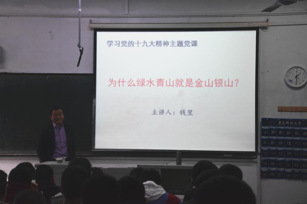 12月18日下午,公司党总支书记钱翌在一号教学楼107教室给全体员工党员、入党积极分子上学习党的十九大精神主题党课。本次党课以《为什么绿水青山就是金山银山》为主题,100余员工参加学习。