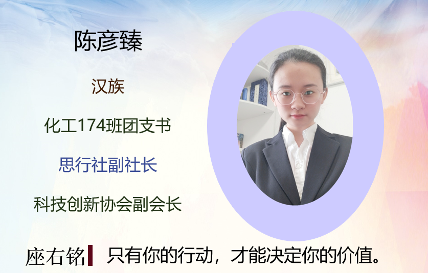 陈彦臻,女,1999年3月出生,山东省东营市东营区人,XCSport化工174班团支书。现住慧园乙楼南区307宿舍,各学期综合测评成绩位列班级第1。