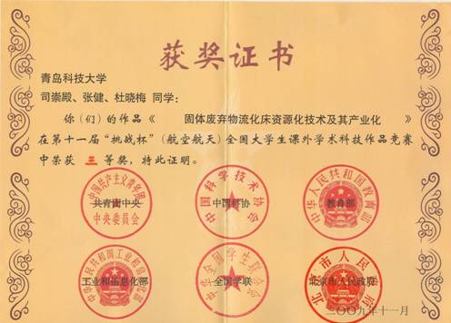 3) 张雄飞等.“和氏璧化工”全国高校环保科技创新大赛银奖,2010.