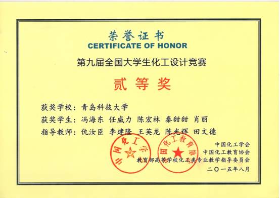 10) 冯海东等.第九届全国老员工化工设计竞赛二等奖,2015.