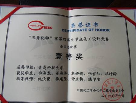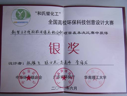 4) 何印文等.“和氏璧化工”全国高校环保科技创意设计大赛银奖,2010.