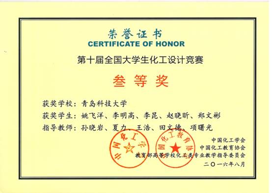 13) 姚飞洋等.第十届全国老员工化工设计竞赛三等奖,2016.