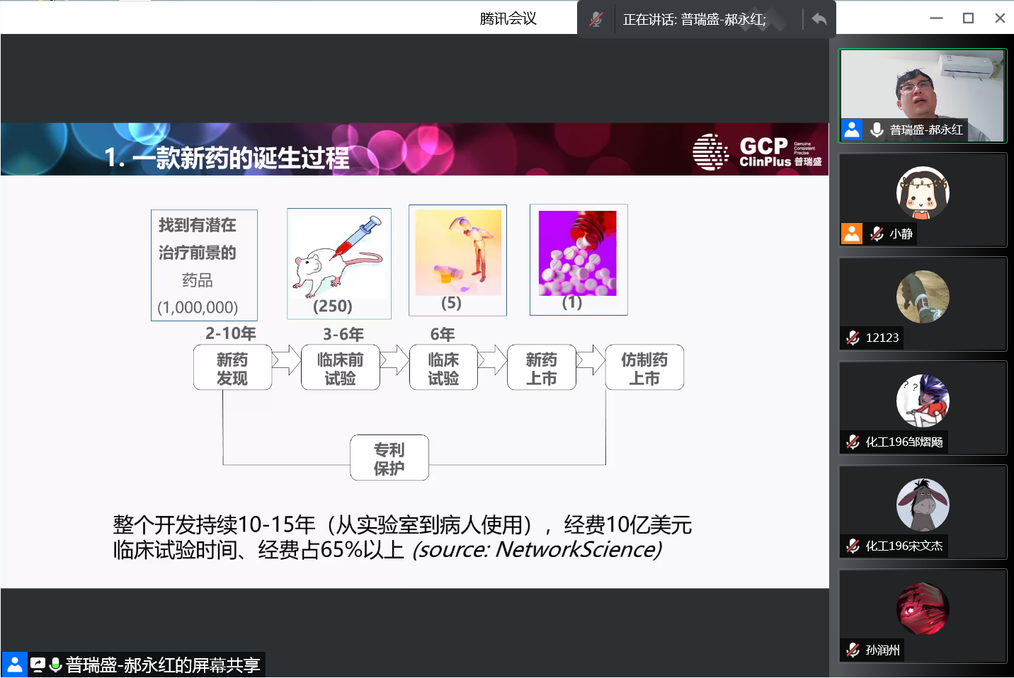 讲座伊始,郝永红结合专业知识,细致入微地讲解了一款新药的诞生过程,引导同学们认识到药物开发是一个长期和复杂的过程。随后郝永红讲述了临床试验的发展历史,通过分析中美科技差距和近几年国内医药行业战略规划,指出我国在医药研发方面有巨大发展空间,行业规模将不断扩大。同时郝永红也介绍了医药研发从业者多样的职业发展空间和岗位用人要求,最后结合个人经历强调个人奋斗的重要性,深入剖析了就业所需的能力,鼓励同学们养成良好的职业习惯,并祝愿同学们就业顺利。