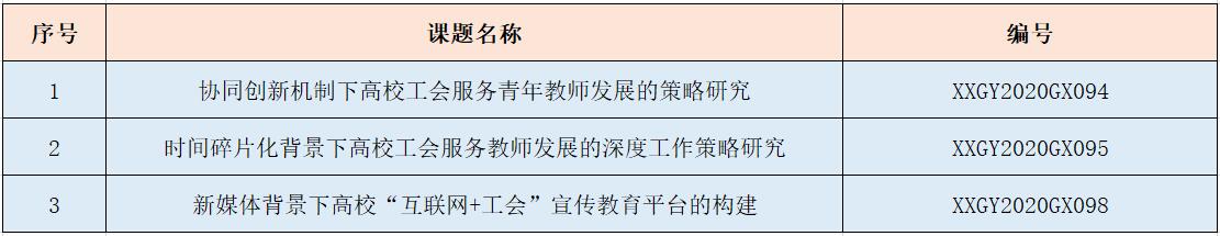 7月1日,中国教育工会山东省委员会、山东省公司工运研究会发布《关于公布2020年全省教育系统工会理论研究和调查研究立项课题的通知》,由XCSport工会组织申报、公司工会推荐,秦洪庆主持的课题《协同创新机制下高校工会服务青年教师发展的策略研究》(课题编号:XXGY2020GX094)、刘彬的课题《时间碎片化背景下高校工会服务教师发展的深度工作策略研》(课题编号:XXGY2020GX095)、付文静的课题《新媒体背景下高校“互联网+工会”宣传教育平台的构》(课题编号:XXGY2020GX098)成功获批立项项目。