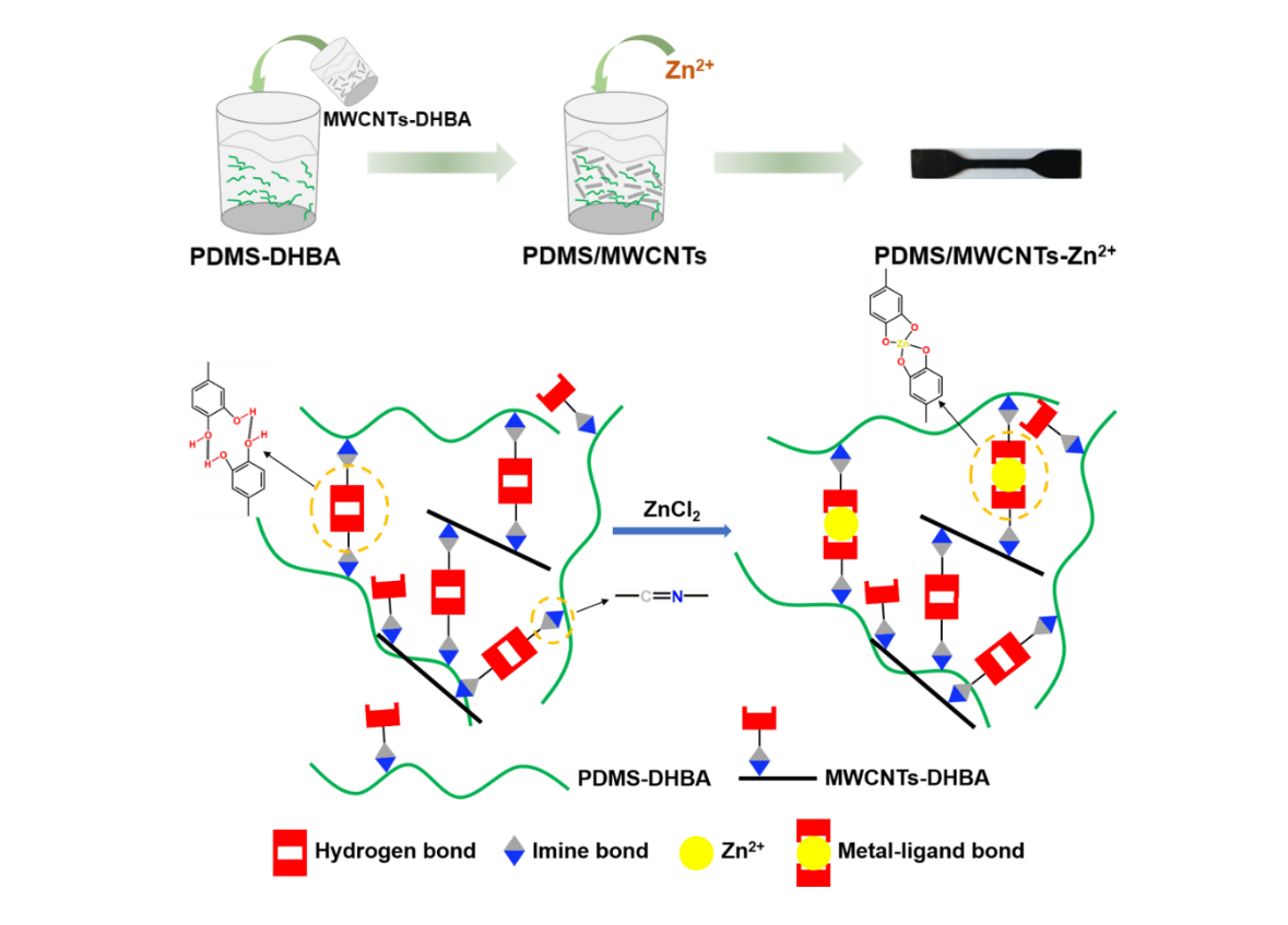 柔性导电复合材料作为可穿戴应变传感器,广泛应用于新一代机器人、电子皮肤、人体检测等领域。然而,如何制备兼具柔韧性、自愈性和传感能力的柔性导电复合材料是一个具有挑战性的研究方向。有机硅材料具有良好的生物相容性、柔性、耐溶剂性、耐高温性等,能够作为一种良好的基体材料用于应变传感器领域。使用有机硅聚合物为主链,并将生物小分子改性后的导电纳米材料与有机硅动态交联网络复合是构建新型柔性导电复合材料的理想方法。