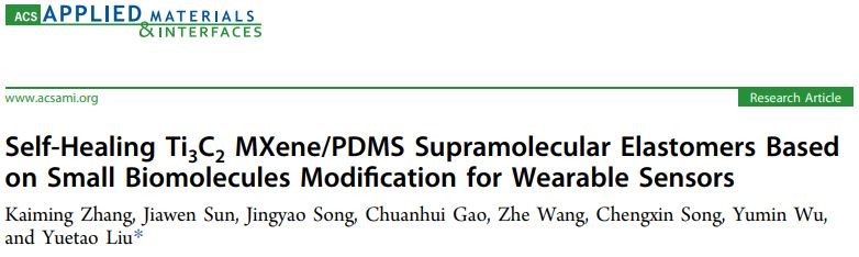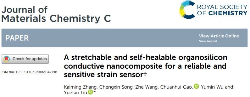 近日,XC体育武玉民、刘月涛、高传慧教授团队报道了关于自修复有机硅应变传感器的相关进展。利用生物小分子改性的导电纳米材料与有机硅动态交联网络复合制备的有机硅应变传感器在力学性能、室温修复性能和应变传感性能等方面表现优异,并在国际知名学术期刊ACS Applied Materials & Interfaces(一区IF=8.758), Journal of Materials Chemistry C (一区IF=7.059)上分别发表了题为“Self-Healing Ti3C2MXene/PDMS Supramolecular Elastomers Based on Small Biomolecules Modification for Wearable Sensors”和“A Stretchable and Self-Healable Organosilicon Conductive Nanocomposite for A Reliable and Sensitive Strain Sensor”的文章。