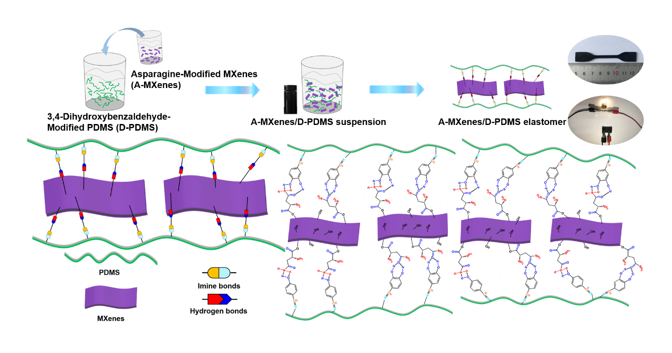 图1.生物分子改性的Ti3C2MXene/PDMS超分子自修复应变传感器