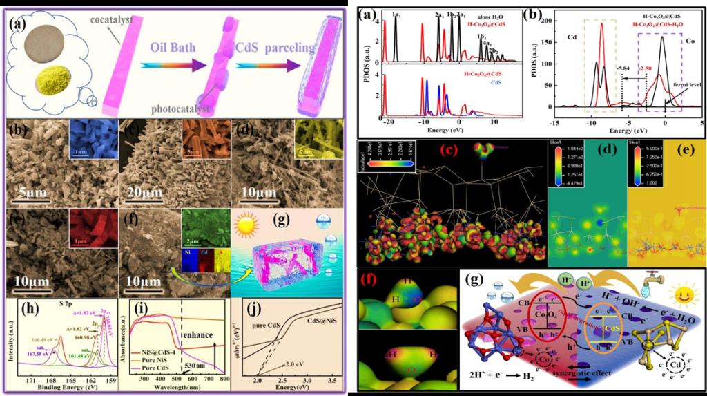 在可见光光照条件下,通过合理调控半导体微观结构可以实现水分子的高效裂解。课题组以泡沫钴为前驱体,合成了一种蜂窝状Co3O4@CdS光催化剂用于可见光水裂解制氢气。此外,以泡沫镍为前驱体,通过一步油浴法成功制备了类“钢筋混凝土”结构的CdS@NiS光催化剂。采用DFT计算,研究发现当水吸附在Co3O4@CdS光催化剂表面时,水分子的轨道能级出现了能量杂化和电子迁移,这一现象有利于实现O-H键的断裂。此外,Co原子的d轨道中心从-5.83提升至-2.58 eV,说明蜂窝状氧化钴可以诱导更多的电子穿越费米能级,加速可见光水裂解制氢气速率。