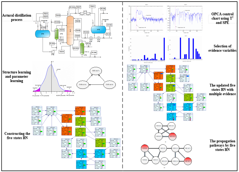 其中,文章“An intelligent quantitative risk assessment method for ammonia synthesis process”针对动态化工过程潜在风险难以预测的情况提出了一种智能的定量风险评估方法(如图1),通过深度学习技术捕捉工艺变量的深层特征,评估工况的风险等级,最终制定控制方案,保证工艺的安全运行。文章“Optimized principal component analysis and multi-state Bayesian network integrated method for chemical process monitoring and variable state prediction”针对化工企业异常工况根原因追溯困难的实际难题,提出了一种先进的过程监控方法(如图2),通过改进PCA以及构建新型多状态贝叶斯网络,做到全面的故障传播路径分析,保障化工企业的安全生产以及异常工况的提早处置。两篇文章均以XC体育为第一单位,XCSport田文德教授为论文的通讯作者,博士研究生刘子健、硕士研究生柳楠分别为两篇论文的第一作者,实验室老师刘彬、李传坤、崔哲参与指导工作。