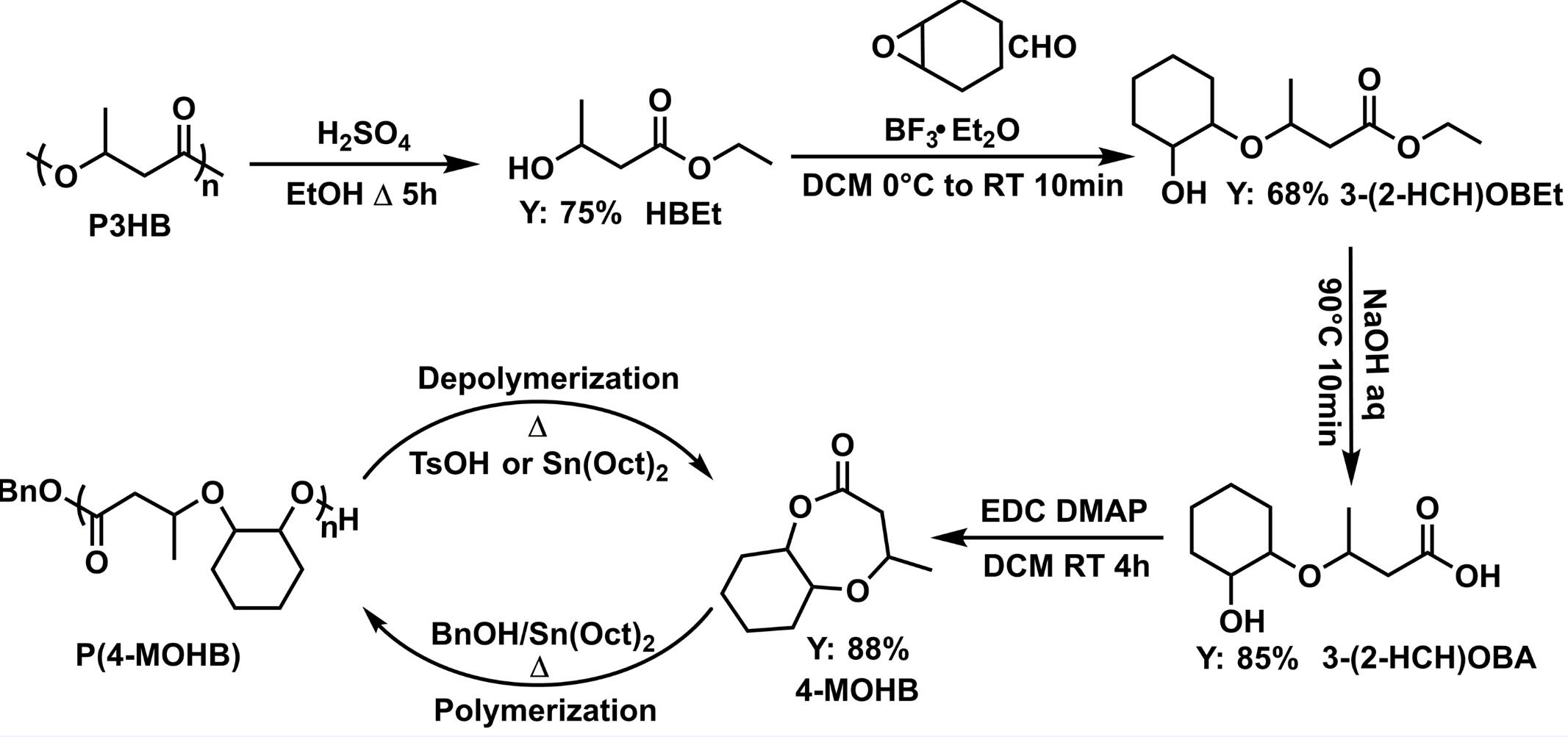 聚(3-羟基丁酸酯)(P3HB)是聚羟基脂肪酸酯(PHAs)家族中最为重要的生物合成塑料,广泛应用于多种领域,并且产量逐年增加。目前P3HB材料的化学回收仅局限于通过热解、醇解或水解得到低附加值化合物。在本工作中,XC体育沈勇副教授和李志波教授团队通过简单高效的合成路线,将P3HB首先降解转化为小分子环状醚酯单体,然后选择合适的催化剂,将其聚合得到新型可化学循环的聚醚酯材料,成功实现废弃P3HB的升级循环。