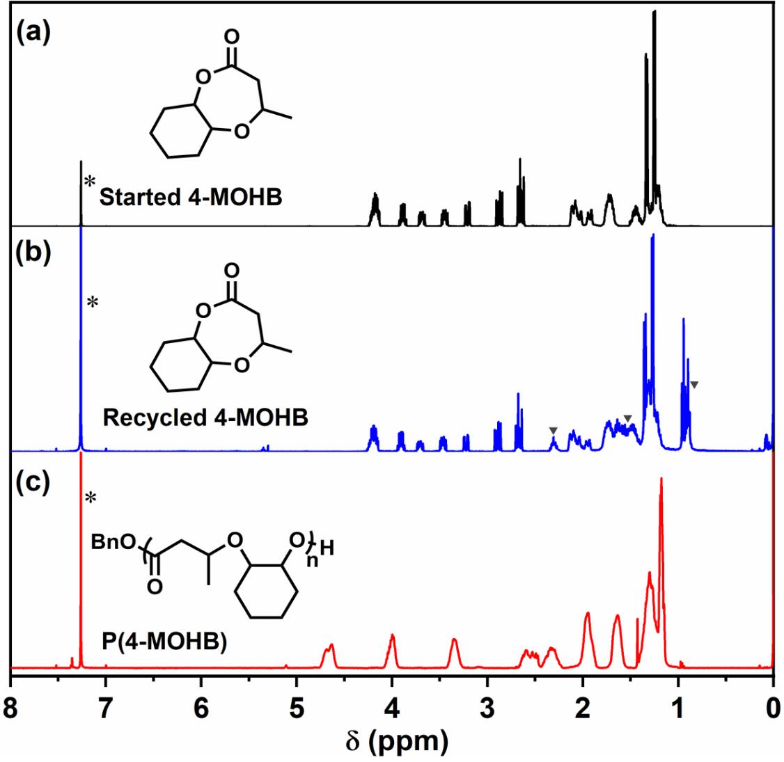 相比于无取代基的醚酯单体(如1, 5-二氧环庚酮,DXO),并环结构的引入赋予了4-MOHB在温和条件下聚合和反向解聚的特性。热力学研究得到聚合焓变和熵变分别为-26.4 kJ mol-1和-51.0 J mol-1K-1,对应在25°C下的聚合吉布斯自由能为-11.2 kJ mol-1。以辛酸亚锡或对甲苯磺酸为催化剂,在稀溶液条件下可以将聚醚酯(P(4-MOHB))高效解聚为4-MOHB。此外在本体条件下减压蒸馏,P(4-MOHB)也可在辛酸亚锡或二乙基锌催化下解聚回收得到4-MOHB。所得4-MOHB单体简单纯化后可重新聚合得到与原单体分子量相同的聚合物,实现了P(4-MOHB)材料的闭合循环。