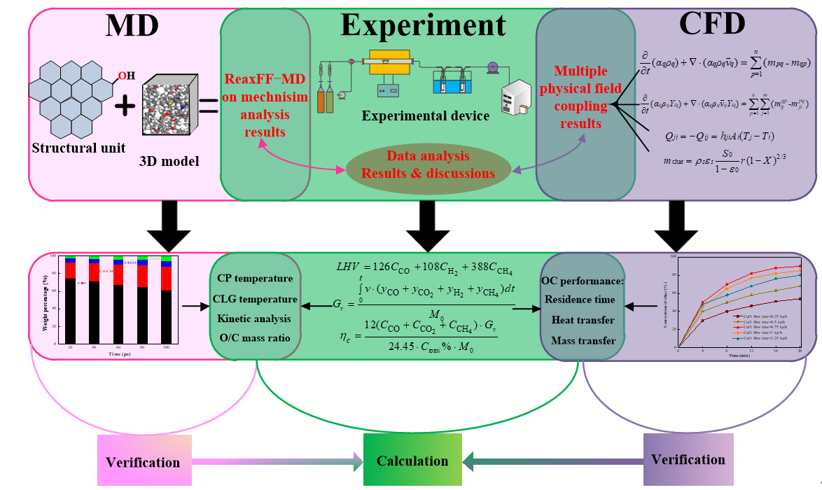文章分别提出了基于新型协同萃取剂微观机理分析的高浓度含酚废水处理动态控制与优化策略(如图1)和基于多尺度模拟与实验测试的煤化学链气化过程全局优化策略(如图2)。从微观到宏观、从模拟到实验的多维研究体系极大程度保证了研究结果的可靠性和可行性,为实际化工装置的污染物处理与减排提供理论指导。该进展的相关文章均以XC体育为第一单位,田文德教授和团队教师崔哲分别为两篇论文的第一作者,博士研究生李哲为第二作者(导师一作)。