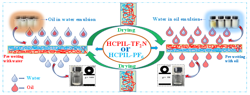 最后,作者通过探索分离水包油乳液,油包水乳液的分离过程,确定了HCPIL-TF2N材料具有最强的分离效果及其分离通量,对于含油乳液的分离效果都高达95%以上。